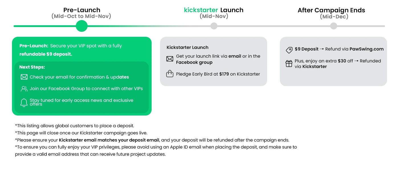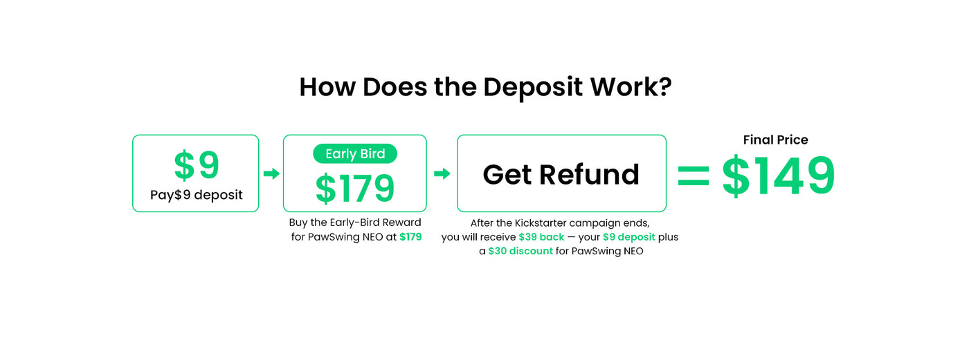 Yes! The $9 deposit is 100% refundable. If you decide not to back the PawSwing Neo on Kickstarter, we’ll return your full deposit.
