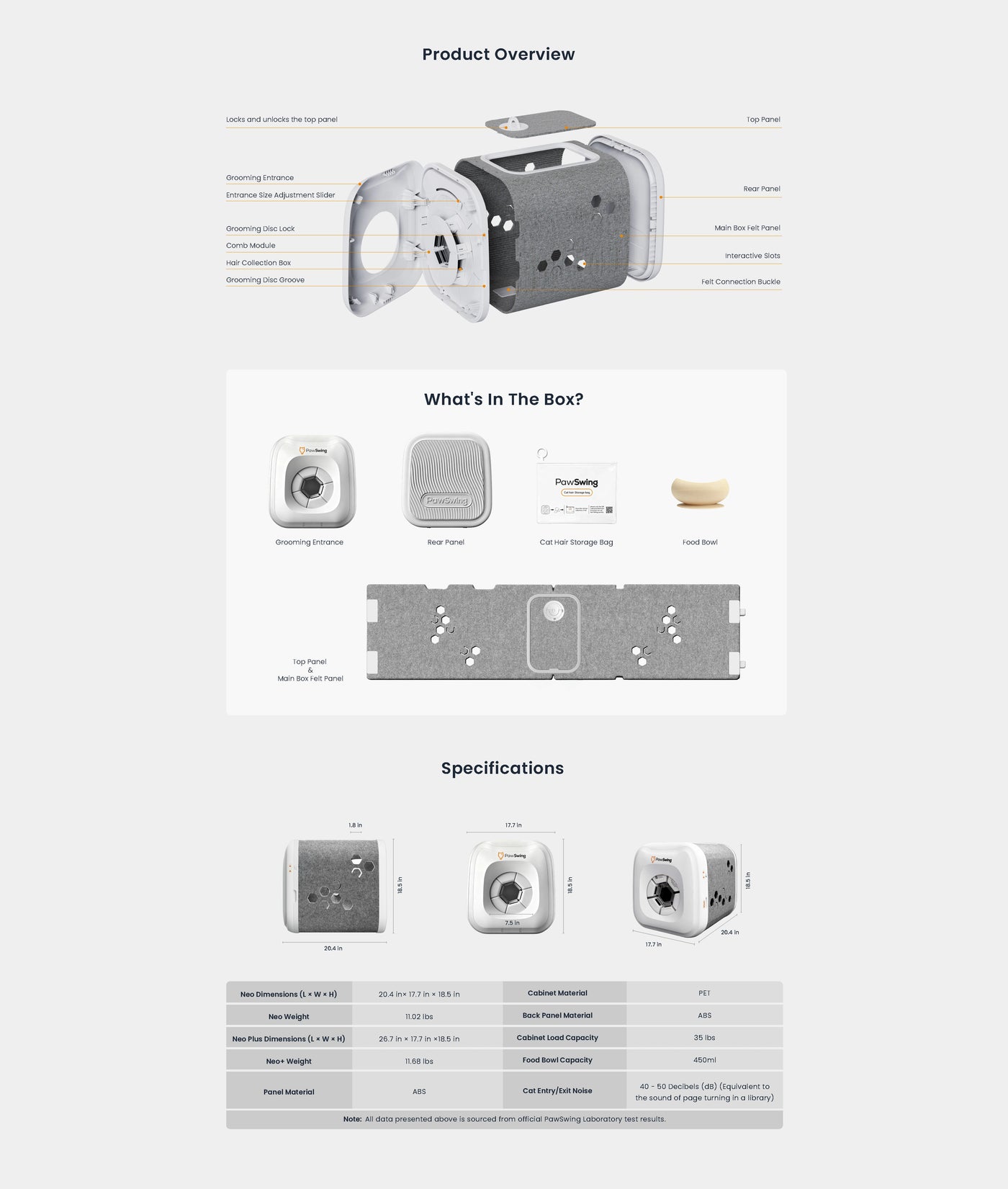 The cat brush for shedding of the two products is the same, but the installation complexity of PawSwing Neo is reduced by 80% compared to PawSwing Pro. The core parts are reduced from 11 to 5, so Pawswing Pro only takes 1 minute to complete the installation.