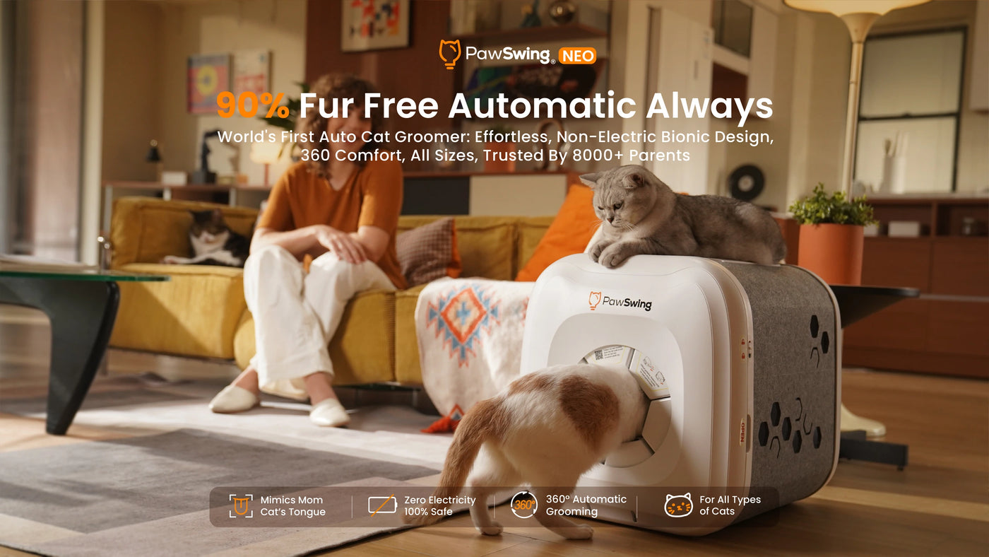 The PawSwing Neo self-grooming cat house is a bio-mimetic grooming system engineered specifically for timid cats and multi-cat households.