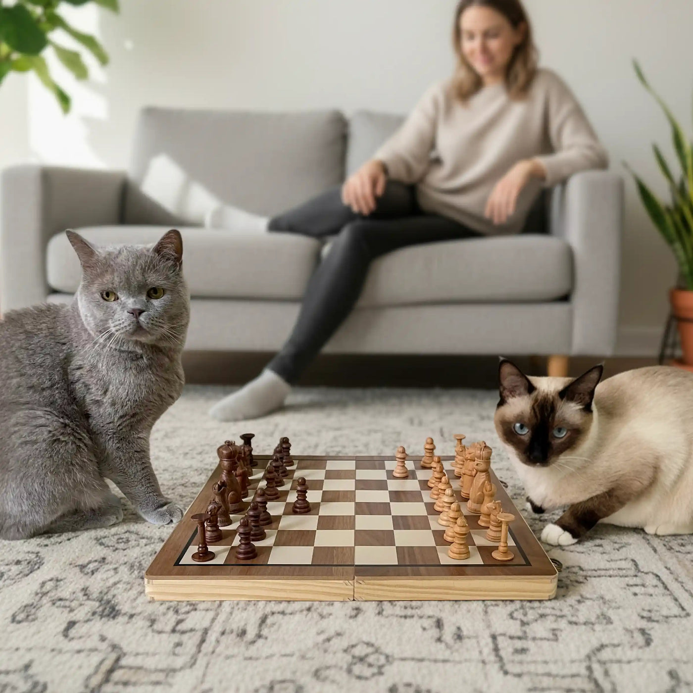 Step into the enchanting world of PawSwing Catstle Handmade Cat Chess Gift! This is more than just a chess set; it's a collector's item that blends feline artistry with exceptional craftsmanship. Each piece is meticulously hand-carved by skilled artisans, perfectly combining traditional chess figures with adorable cat motifs. This creates a one-of-a-kind playing experience where every move you make with these lifelike cat pieces feels like a touch of art.