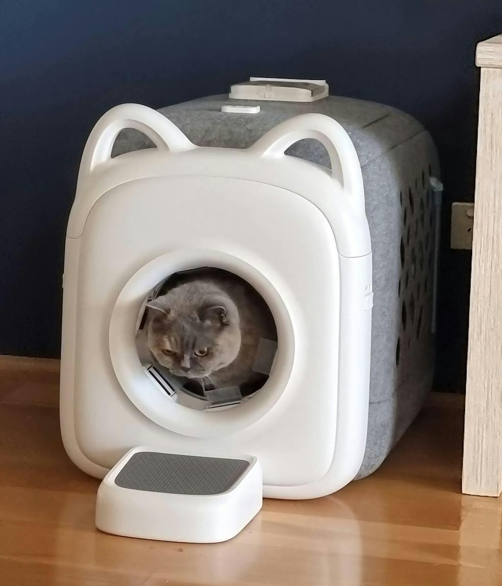 As your cat comes in and out, he will come into contact with the 360° power plate and comb. The power plate uses the power provided by the cat to expand the cat comb outward. The comb will evenly and gently adhere to the cat's body. The cat hair brush will capture loose fur, massage the skin, and collect the shed hair in a dedicated compartment, all while your cat enjoys the meal.
